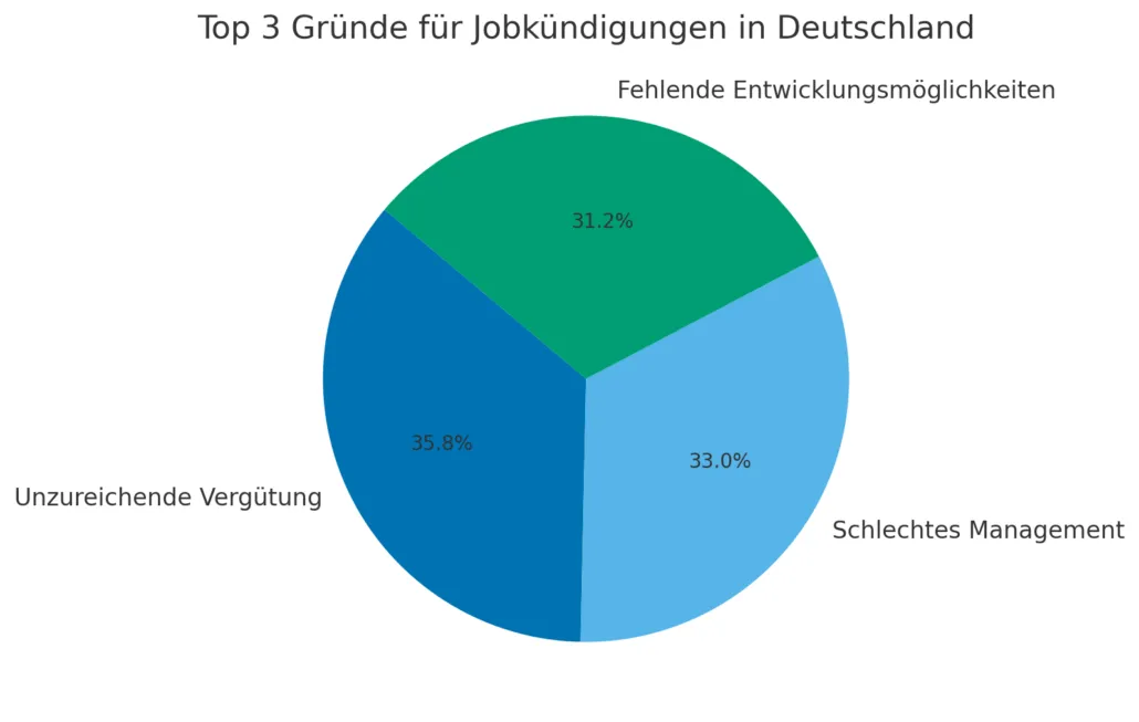 Eine aktuelle Umfrage von McKinsey unter 1.286 Beschäftigten in Deutschland zeigt, dass die häufigsten Kündigungsgründe unzureichende Vergütung (39 %), Unzufriedenheit mit Führungskräften (36 %) und fehlende Entwicklungs-und Weiterbildungsmöglichkeiten (34 %) sind. Diese Zahlen verdeutlichen, wie wichtig es ist, auf klare Perspektiven und faire Bedingungen zu achten.