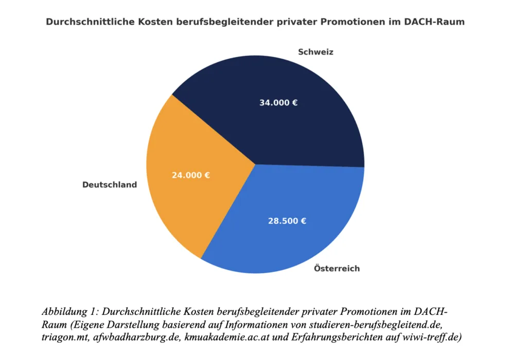 - Studien- und Verwaltungsgebühren: Im DACH-Raum liegen die durchschnittlichen Gesamtkosten für private berufsbegleitende Promotionen zwischen ca. 24.000 € (Deutschland), 28.500 € (Österreich) und 34.000 € (Schweiz), wie in Abbildung 1 dargestellt. Bei GoVersity ist eine Promotion beispielsweise schon ab 23.050 € möglich.