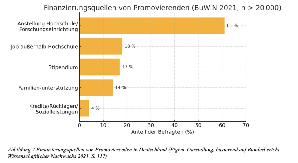 Es gibt viele Wege, deine Promotion zu finanzieren. Zahlen aus dem Bundesbericht Wissenschaftlicher Nachwuchs 2021 (siehe Abbildung 2) zeigen, dass 61 % aller Promovierenden ihre Promotion über eine wissenschaftliche Anstellung finanzieren, 18 % über Jobs außerhalb der Hochschule, 17 % über Stipendien und 14 % durch familiäre Unterstützung, während Kredite und Rücklagen mit jeweils unter fünf Prozent nur eine Nebenrolle spielen (BuWiN 2021, S. 117)