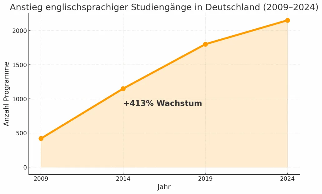 Eine aktuelle Studie aus Wissenschaft weltoffen zeigt, dass sich die Zahl der englischsprachigen Studiengänge in Deutschland seit 2009 mehr als verfünffacht hat: 2009 gab es bundesweit nur rund 419 englischsprachige Programme, 2024 sind es bereits über 2.150, Tendenz weiter steigend. Dabei sind rund 82 % aller englischsprachigen Studienangebote Masterprogramme.