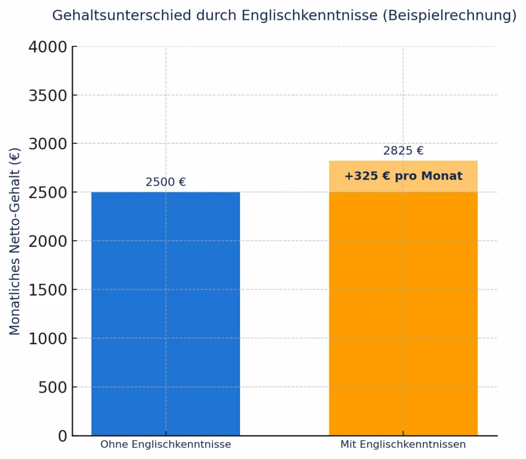 Klingt erstmal wenig, aber macht doch einen Unterschied! In Abb. 2 haben wir dazu eine kurze Beispielrechnung durchgeführt: Bei einem Netto-Monatsgehalt von 2.500€ wären 13% ganze 325€ mehr im Monat. Auf das ganze Jahr gerechnet würdest du so 3900€ extra verdienen, mehr als ein 13. Monatsgehalt, einfach nur durch Englisch! Damit lassen sich locker ein extra Urlaub im Jahr oder spannende Hobbies, die du schon immer starten wolltest, finanzieren.