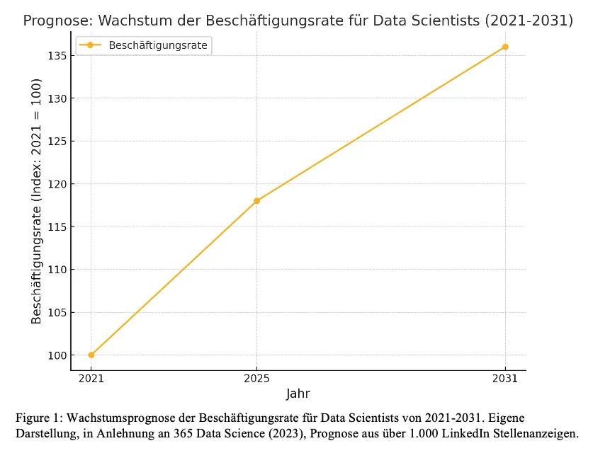 Die Nachfrage nach Expert:innen für Data Science und KI steigt rasant. Laut einer Studie von 365 Data Science (2023) wird die Beschäftigungsrate für Data Scientists zwischen 2021 und 2031 um beeindruckende 36 % wachsen. Unternehmen weltweit setzen zunehmend auf datengetriebene Entscheidungen – das eröffnet Dir großartige Möglichkeiten!