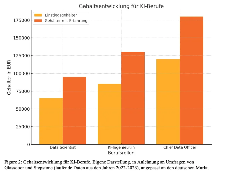 - Gehaltssteigerungen: Einstiegsgehälter in der KI beginnen bei 60.000 € und steigen für erfahrene Fachkräfte auf 150.000 € – gerade in Deutschland.