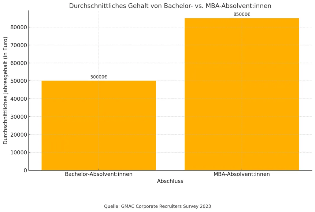 - Gehaltssprung: Laut der GMAC Corporate Recruiters Survey 2023, einer umfassenden Umfrage der Graduate Management Admission Council (GMAC), die hauptsächlich in den USA aber auch an anderen internationalen Märkten durchgeführt wurde, verdienen MBA-AbsolventInnen im Durchschnitt 50-70% mehr als ihre KollegInnen mit nur einem Bachelor-Abschluss.